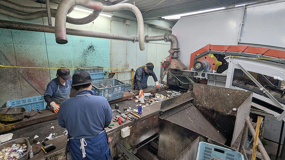 当社では、受け入れた不燃ごみを、人の手と機械を組み合わせた高度な選別システムで、金属類、プラスチック類などに細かく分類しています。これにより、廃棄物の埋立量を大幅に削減し、資源の再利用を最大限に高めています。