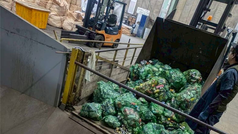 缶・びん類とペットボトル・その他プラスチック類は別々に処理するため、缶・びん類は袋から出して受入ホッパを通します。